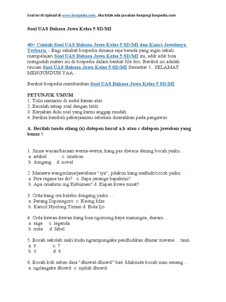 Artikel ini akan menyajikan kumpulan contoh soal UAS Bahasa Jawa kelas 5 SD semester 1 yang mencakup berbagai aspek pembelajaran, mulai dari membaca, menulis, mendengarkan, hingga berbicara. Setiap soal akan disertai dengan penjelasan singkat untuk membantu siswa memahami konsep di baliknya. Dengan total perkiraan 1.200 kata, artikel ini diharapkan dapat menjadi panduan belajar yang komprehensif dan bermanfaat bagi para siswa, orang tua, dan guru.